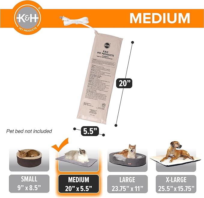 - SIZE & ENERGY-EFFICIENT: K&H Medium Pet Bed Warmer measures 20" x 5ยฝ", making it perfect for medium pet beds, and it uses only 6 watts of power, ensuring low energy consumption while providing cozy warmth for your pet
