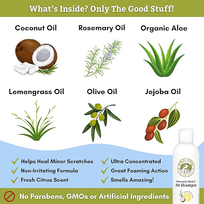 - SAFE & GENTLE FOR ALL PETS: Wholistic Heavenly Herbal natural dog shampoo concentrate for dry, sensitive skin contains a powerful blend of certified organic essential oils and extracts with amazing moisturizing properties; it's made with no harmful ingredients