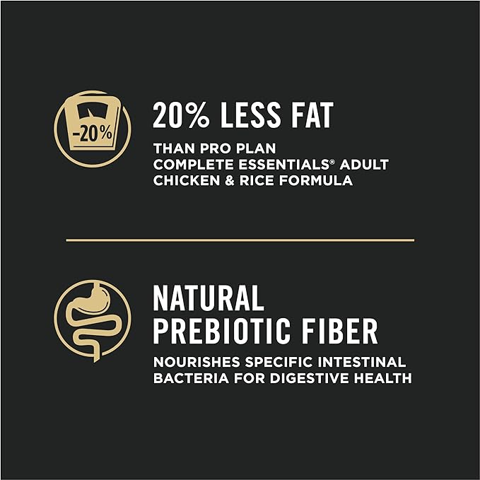 - 20 percent less fat than Pro Plan COMPLETE ESSENTIALS Adult Chicken and Rice Formula