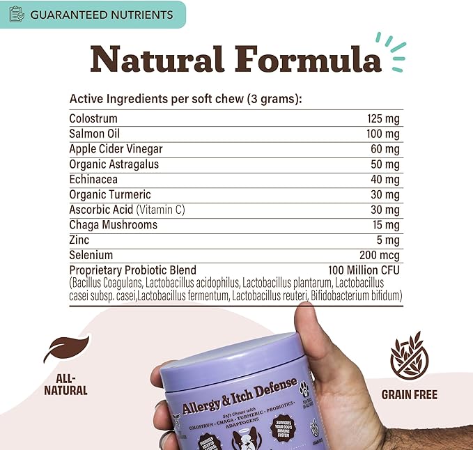 - ALLERGY RELIEF & IMMUNE SUPPORT: Supports seasonal allergy relief for dogs with a powerful blend of colostrum, turmeric, echinacea, and salmon oil. This daily dog allergy supplement promotes normal histamine response and boosts the immune system to help your pup stay comfortable through pollen, grass, and other environmental allergies.
