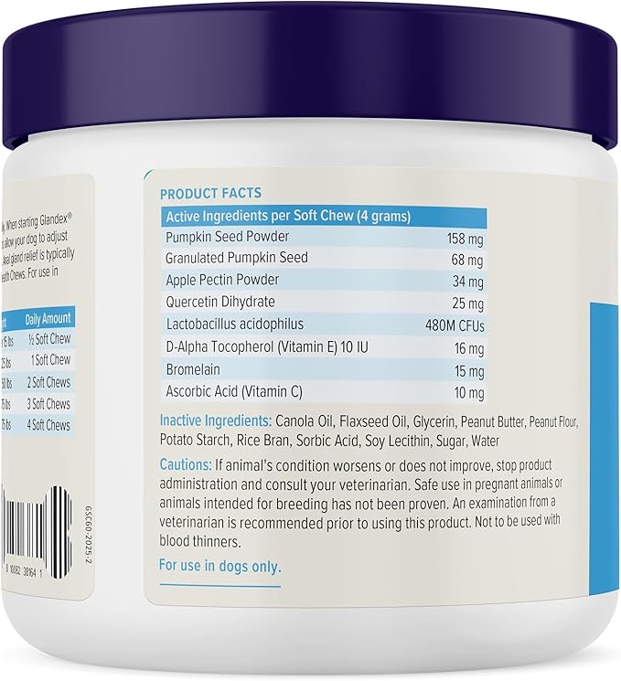 - MADE IN USA: Glandex is proudly made in the USA using the highest quality ingredients. Glandex is easy-to-use and comes as an irresistible peanut butter treat! Give once daily based on your petโs weight.