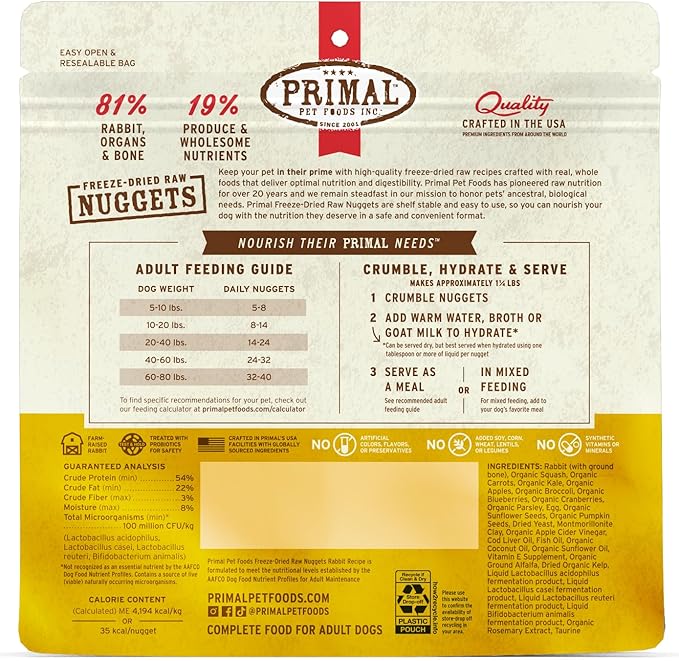 Primal Freeze Dried Raw Dog Food Nuggets, Rabbit, Complete & Balanced Meal, Also Use as Topper or Treat, Premium, Healthy, Grain Free, High Protein Raw Dog Food, 5.5 oz
