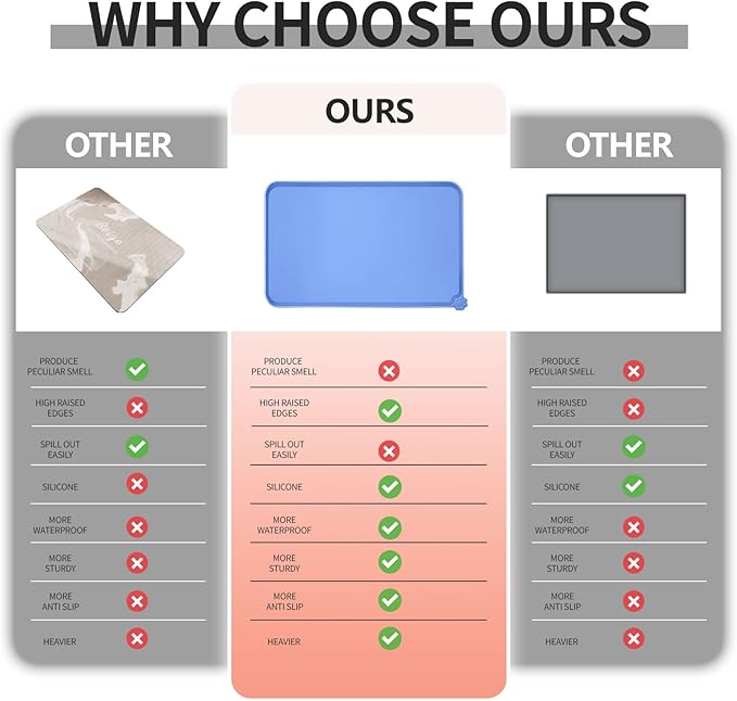 - Various sizes available: our pet mats come in 5 different sizes - 18.5" x 11.5", 22" x 14", 24" x 16", 28" x 18", and 32" x 24". Suitable for all kinds of pets, from puppies to large pets, choose the perfect size for your furry friends and avoid messy spills at mealtime