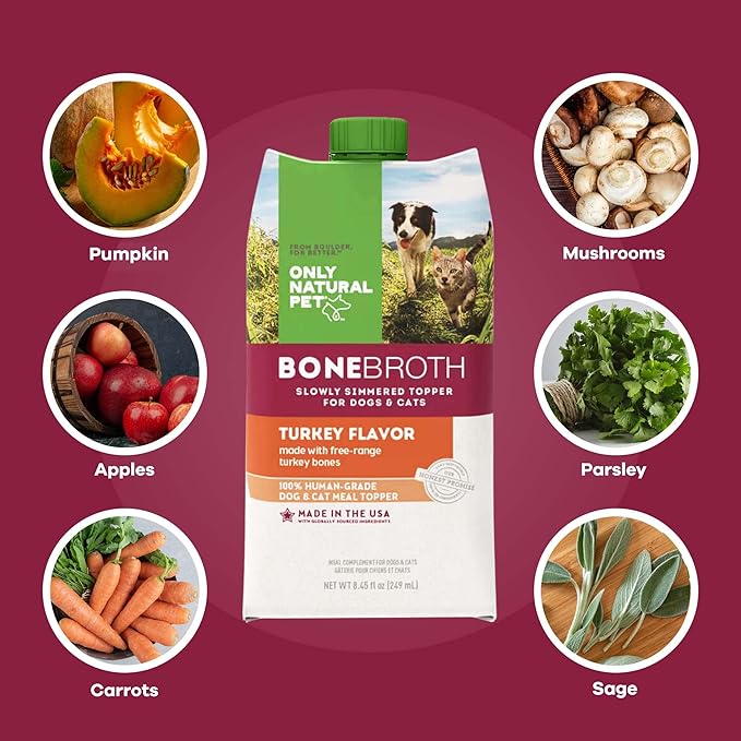 - Use as a Meal Topper on Dry Food or to Hydrated Dehydrated Food: Discover the delicious, nutritious, hydrating goodness of Only Natural Pet Bone Broth Turkey Flavor Dog & Cat Meal Topper. This nutritious turkey flavor broth features free-range turkey bones and turkey fat, pumpkin, apples, carrots, mushrooms, sage, parsley, and turmeric