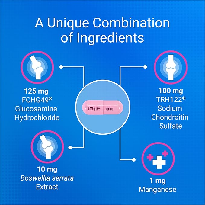 - Contains Glucosamine for Cats - Cosequin contains glucosamine hydrochloride (FCHG49) and sodium chondroitin sulfate (TRH122). This unique combination of ingredients supports healthy joints.
