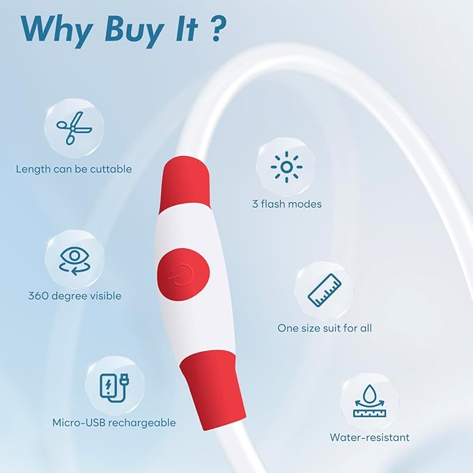 - ★Simplicity Meets Safety with the Easy-to-Use LED Dog Collar: Keep your pet safe during nighttime walks with the LED Dog Collar. Its simple design features a TPU tube that easily slides over your pet's neck and secures in place. Change the flash mode with a press of the silicone power button for convenient use. Experience the peace of mind that comes with the Easy-to-Use LED Dog Collar.