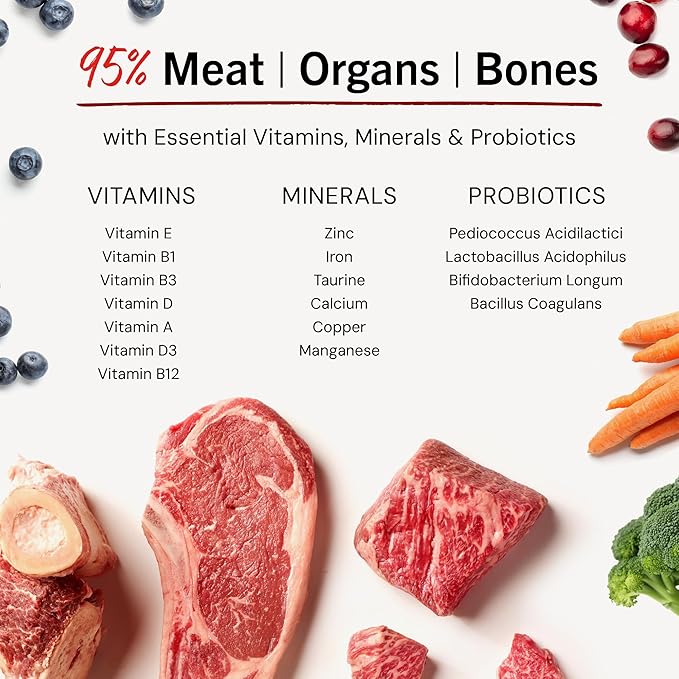 - 95% RED MEAT, ORGANS & BONE -- Premium freeze-dried raw nutrition with whole-prey approach combines beef, lamb, and goat for diverse protein that supports muscle development, digestibility, and natural nutrients for coat, skin, and overall health.