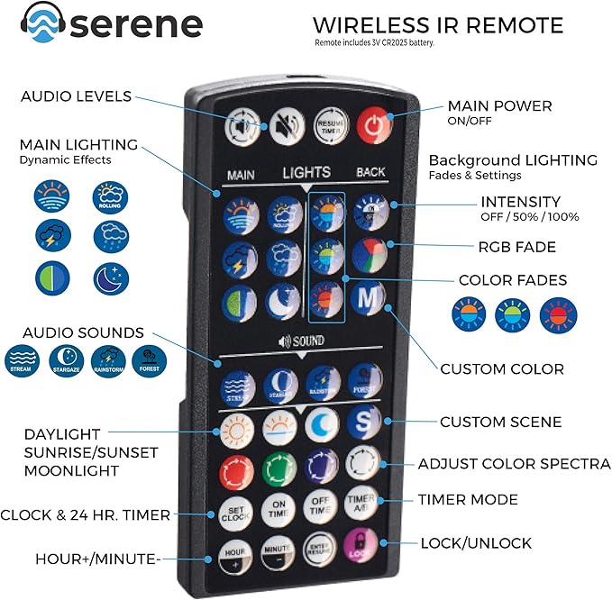 - EVERYTHING’S HERE Serene is a complete system that includes the all new Serene LED fixture for above the aquarium, an LED light for behind the aquarium, translucent background film material, audio speakers, and a wireless remote.