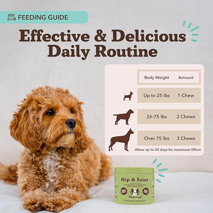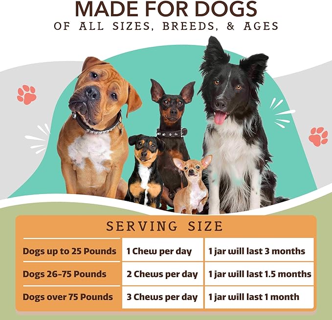 - USAGE MADE SIMPLE: Experience hassle-free administration with our easy-to-follow instructions, ensuring effective use for maximum joint support and overall vitality. For dogs under 25 lbs, give 1 chew per day; for dogs 26-75 lbs, administer 2 chews per day; for dogs over 75 lbs, provide 3 chews per day to support their joint health.