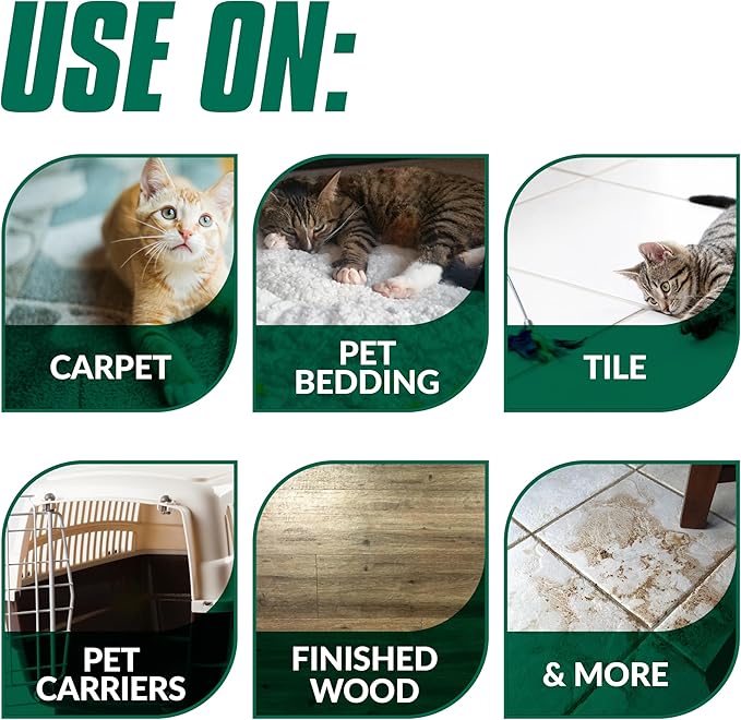 - Use on carpets, rugs, pet bedding, upholstery, clothing, curtains, Auto upholstery, litter boxes, crates and carriers, tile, finished wood, laminates, concrete and more