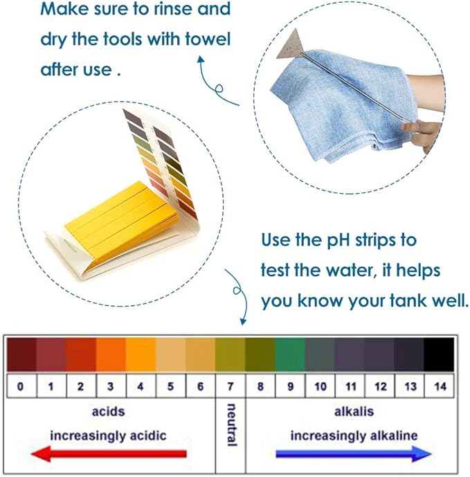 - Service warranty - Your satisfaction is our lifetime goal. We are committed to providing you with the most satisfactory products. The package includes 5 aquascape tools with 100 strips PH Tester. If you discover some parts missing when you receive it,contact us,we promise to resend it.