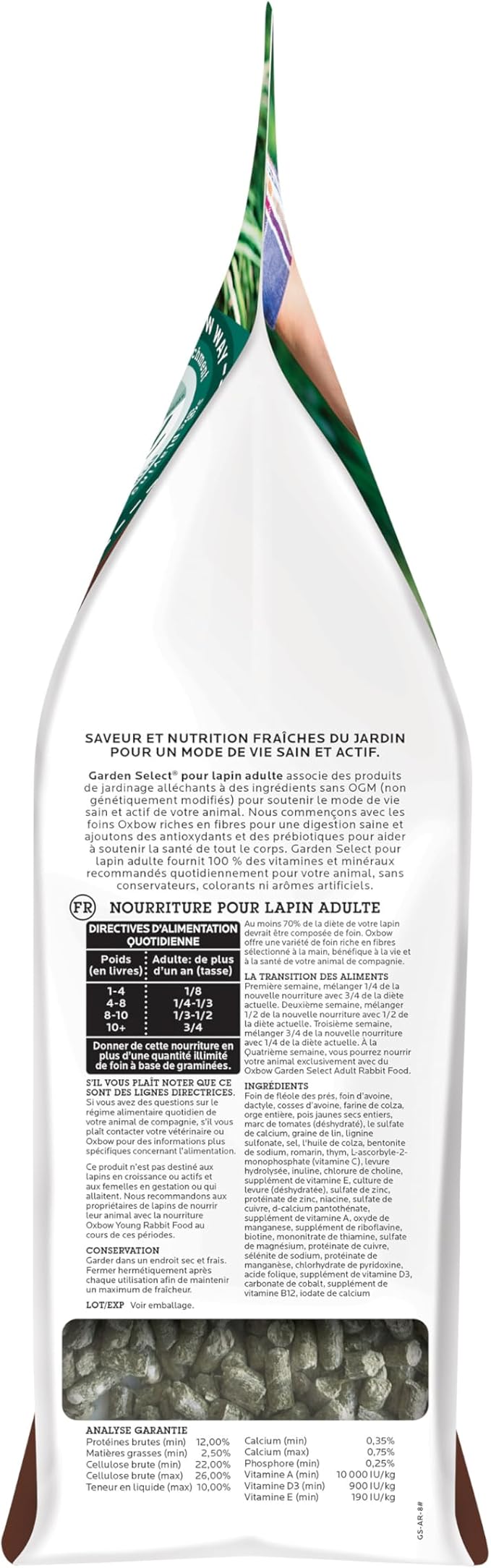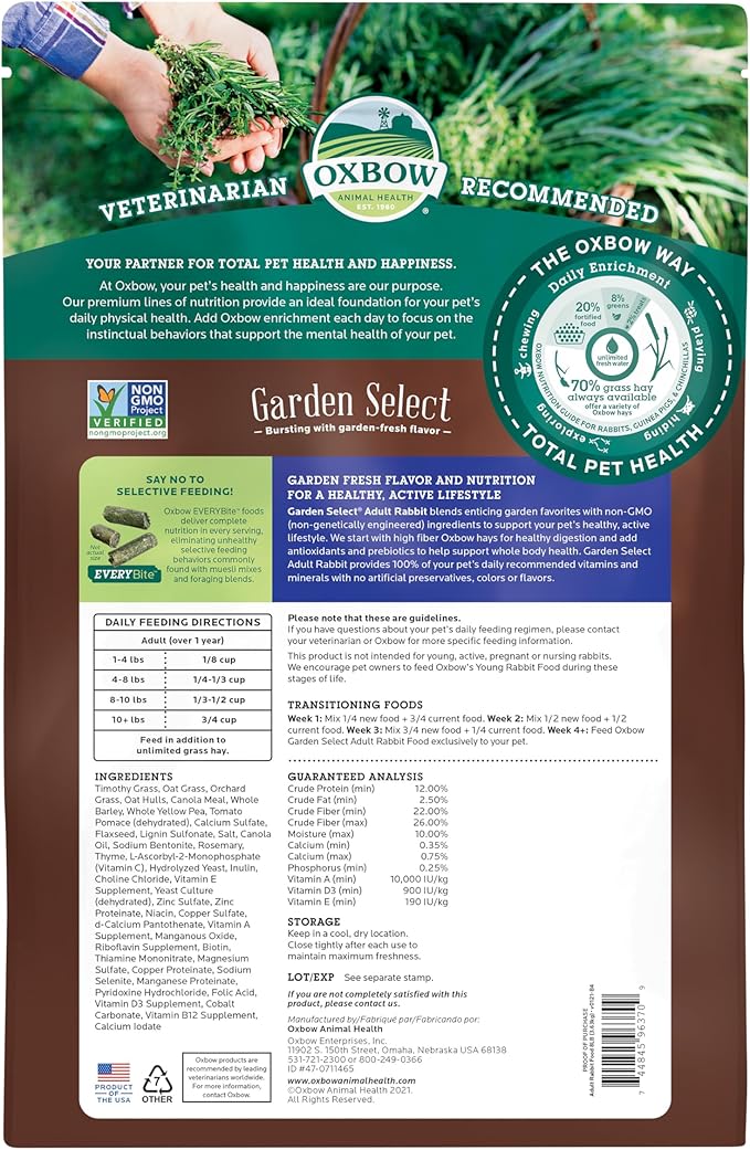 - NON-GMO: Oxbow Garden Select Adult Rabbit Food is made with non-GMO ingredients you can trust; These rabbit and bunny pellets provide a natural, unaltered diet that supports your pet’s health while meeting the highest standards of quality and care