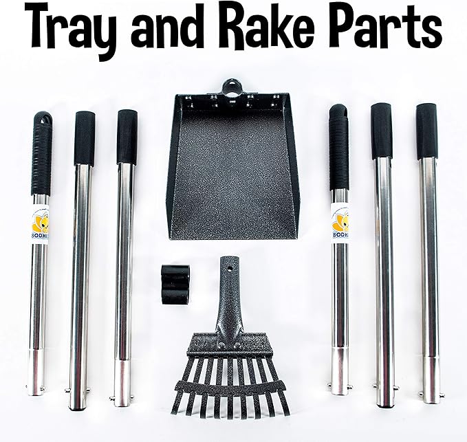 - Premium Materials: We use premium high-quality stainless steel that is designed to last you years of easy waste management for your yard. Not only is picking up after your pet comfortable and easy but our metal pooper scooper with rake and bin can be hosed off to clean and will not rust. Make sure you are getting a real high-quality Bodhi Dog product with our easy to spot Bodhi Dog logo stickers on your Pooper Scooper Tray and Rake handles!