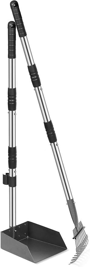 - Pooper Scooper Equipment in Pack: 1 tray and 1 rake kit meet almost all the needs of using. The size is over 37 inches, you need not bend over when clean pet poop.