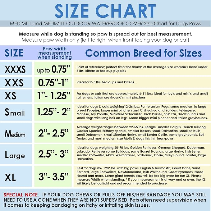 - XS – paw width measurement when standing: between 1”- 1.25. For dogs or cats approximately 6-11 lbs.: ideal for toy’s and mini’s and small rat terriers, Italian greyhound’s mini pinchers IF YOUR DOG CHEWS OR PULLS OFF HIS/HER BANDAGE YOU MAY STILL NEED TO USE A CONE WHEN THEY ARE NOT SUPERVISED. Pets often need supervision when it comes to keeping bandaging on itchy or irritating skin issues.