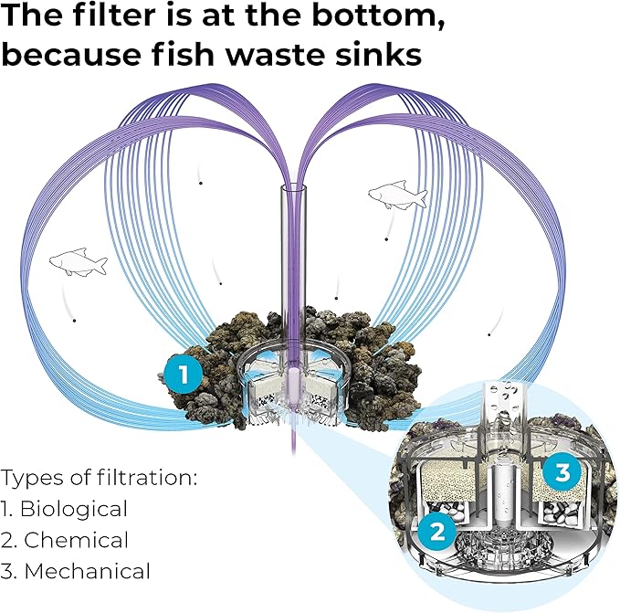 - PATENTED FILTRATION SYSTEM IS EASY TO MAINTAIN — All biOrb aquariums have a true 5-stage filtration system including biological, mechanical, chemical, water stabilization and oxygenation that keeps it clean. The filter is conveniently located at the bottom of the aquarium, and the ceramic media surrounding it promotes the growth of beneficial bacteria.