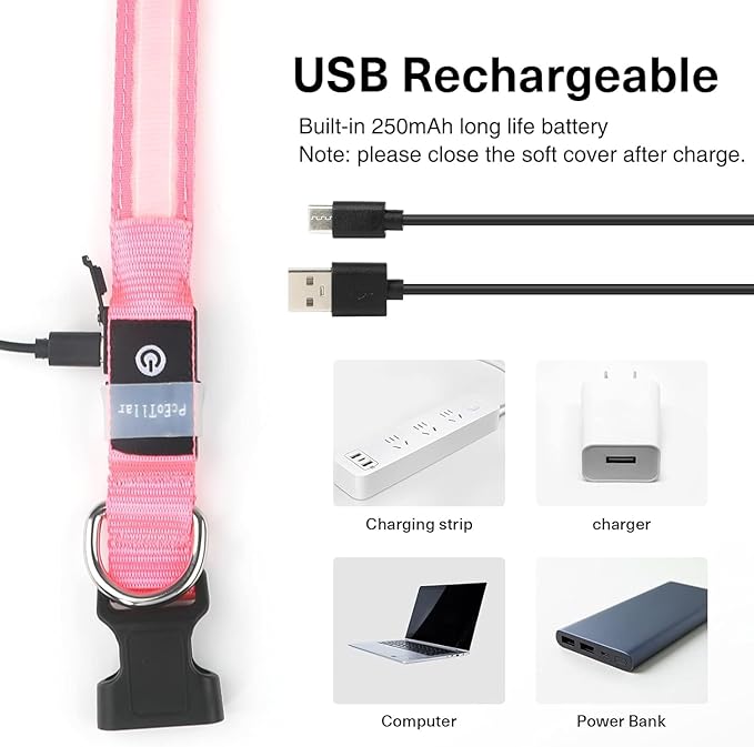 - ➤ Rechargeable Led Dog Collar - PcEoTllar dog collar is waterproof. No worries about the collar when your dog is swimming or playing under the water! Please close the Soft Charging Cover after charging and please stay away from sea-water. Rechargeable with any other daily USB device is more convenient, you will not paying for batteries anymore! Full power can last 10 hours.