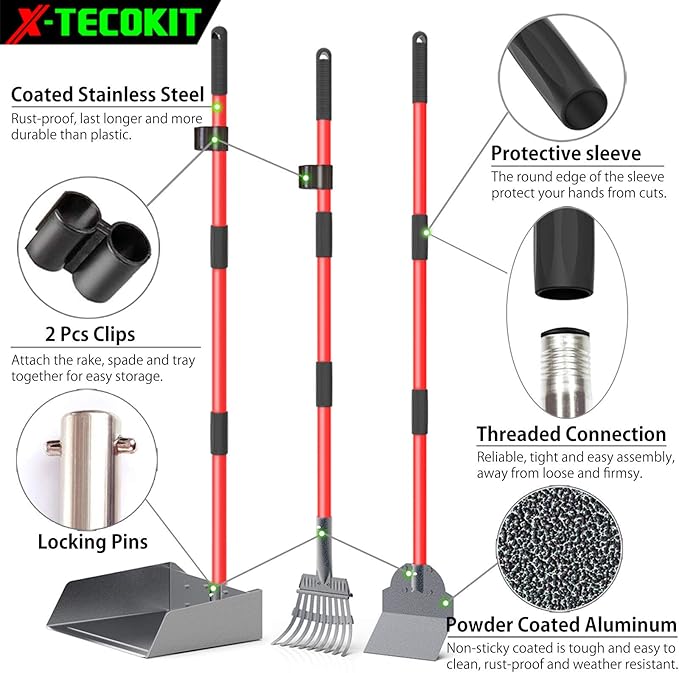 - โค Super Value Larger Pooper Scooper Set: Comes with rake, spade and large tray together. Made of powder-coated stainless steel & aluminum, more durable and last longer than plastic pooper scooper. The rake allows for hassle-free pick-up on grass, sand and dirt while the spade is made for flat surfaces like sidewalks, patios, driveways and kennels, and designed with 37.5inch long handles, so you donโt have to bend down. This Dog Waste Scooper Set makes cleaning up after your dog easier than ever