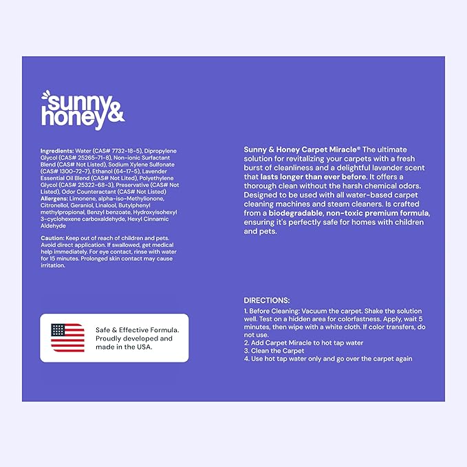 - Ultimate Carpet Clean-Up: Sunny & Honey Carpet Miracle is your go-to carpet cleaner solution that fights tough stains and pet messes. Compatible with any carpet cleaner machine, it makes your carpets feel brand new and smell fresh