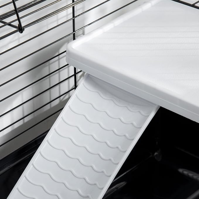 - Elevated Platform & Pet Accessories: This pet cage comes with an elevated platform to create a private space underneath. A food dish, hay feeder, and water bottle are included.