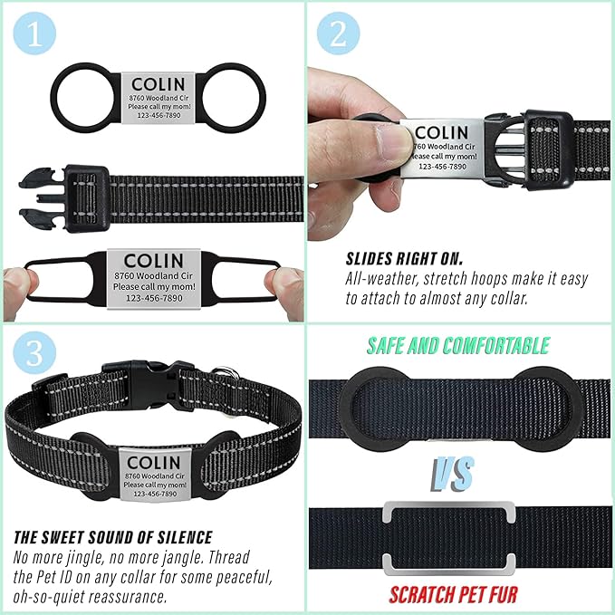 - ๐ถ Silent, Durable, And Lightweight Dog Tags: Made from rustproof stainless steel & silicone, our pet tags for dogs and cats will stand the test of time. The easy, slide-on design makes our pet ID tag silent and ideal for puppies and kittens.