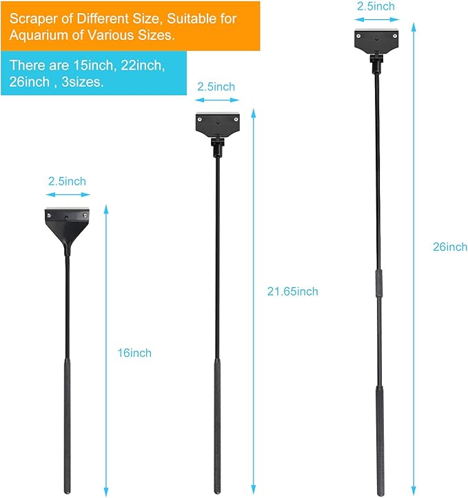 - Multiple specifications are available: We provide three different lengths of algae scrapers, 16, 21, 26 Inches, you can choose the appropriate length according to the height of the fish tank.