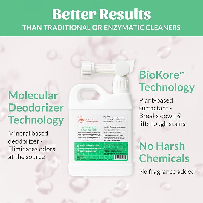 - Eliminates Odors - This pet urine odor destroyer eliminates odor at the molecular level, leaving your outdoor living spaces fresh and clean without any lingering smells.