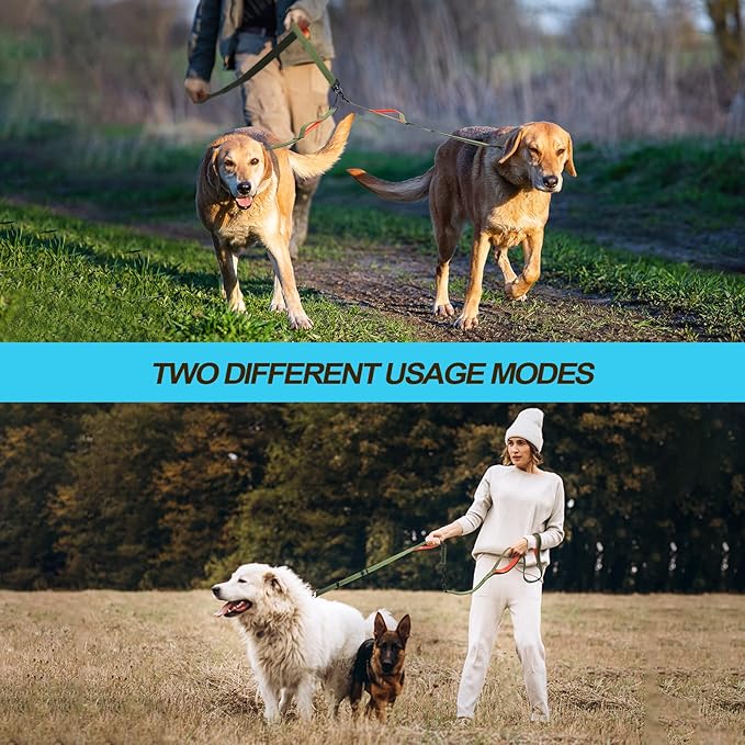 - No Tangle Double Dog Leash: 360° swivel clasps help to keep your dogs from getting tangled together. No need to worry about getting twisted two dog leash when dogs switch sides