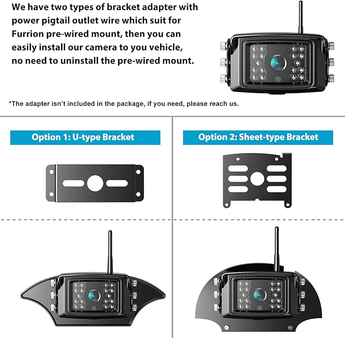 - 【IP69 Waterproof Cameras】The IP69 waterproof camera works perfectly in any extreme weather. With 18 infrared lights, the camera can provide HD night vision for you. The lens of the camera can be adjusted up and down, allowing you to view from different angles. The hard metal housing makes the camera serve longer for you.(It can work with Furrion pre-wired RV, please ask us for the bracket adapter.)
