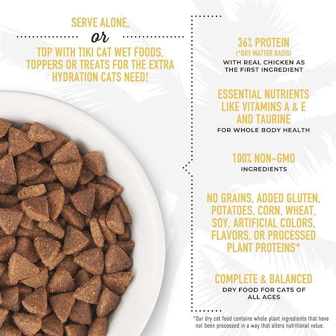 - SATISFYING, CRUNCHY KIBBLE - Tiki Cat Born Carnivore Indoor Health dry cat food is minimally processed and packed with meaty flavors from real ingredients that cats crave.