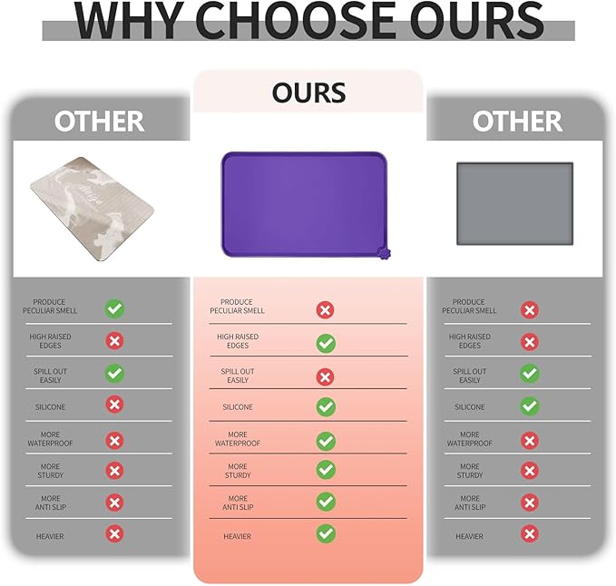 • Various sizes available: our pet mats come in 5 different sizes - 18.5" x 11.5", 22" x 14", 24" x 16", 28" x 18", and 32" x 24". Suitable for all kinds of pets, from puppies to large pets, choose the perfect size for your furry friends and avoid messy spills at mealtime