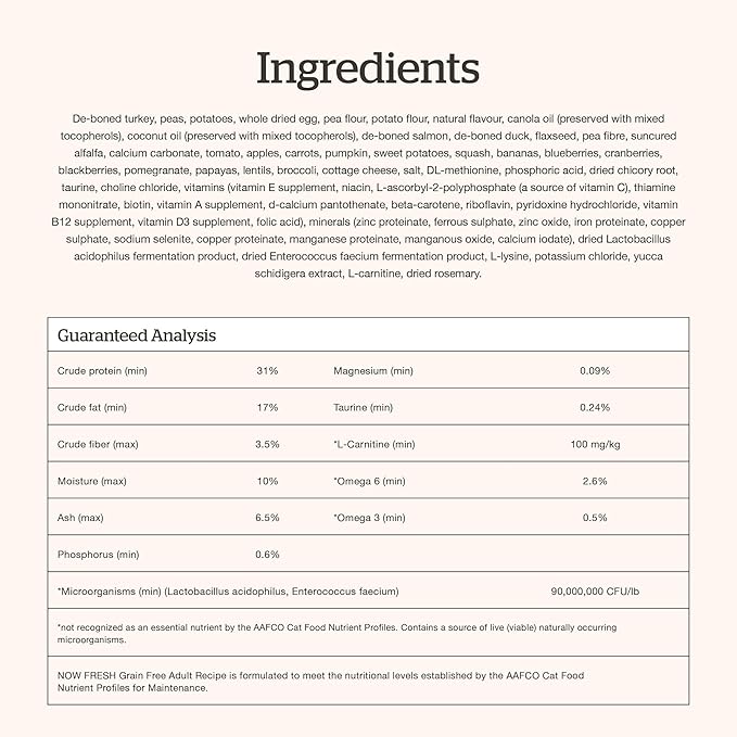 Now Fresh Grain-Free Dry Cat Food with Turkey, Salmon & Duck, Healthy Kibble for Adults Made with Real Meat & Fish, Chicken-Free, with Pumpkin & Probiotics for Sensitive Stomachs, 16 lb Bag