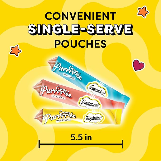 - Cats Lose Their Cool: Temptations Creamy Puree Wet Cat Treats deliver irresistible chicken, salmon, or tuna flavor in squeezable, creamy cat puree tube treats they’ll come running for