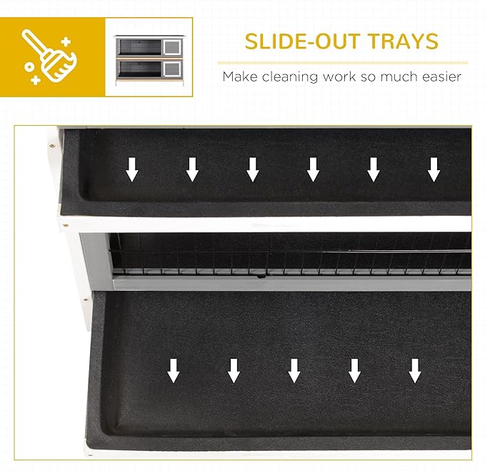 - Easy Access: This rabbit cage outdoor makes things simple for you. You can open the cage with multiple side doors that can close. Then, two pull-out trays for easy access to the inside space for cleaning, feeding, and more.
