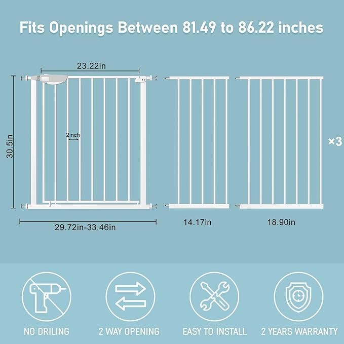 - 【Multi Use】The width of the triple lock extra wide pressure mounted baby gate can be adjusted from 25.59 inches to 81.49 inches so that it is available for stairs, doorways, and other diverse occasions to stop babies or pets to climb over. Tips: before installation, there will be a gap between the wide gate latch and the frame which is NOT a defect and it is NOT bent. This gap will disappear once installed.