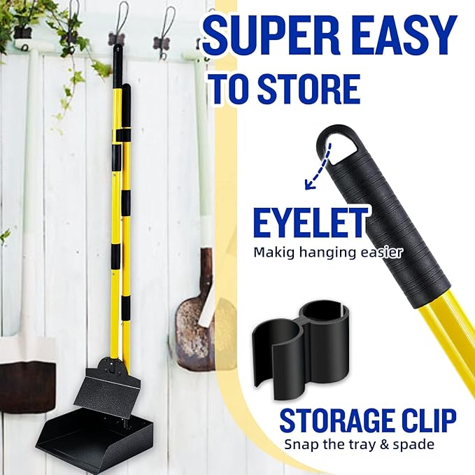 - ★ EASY TO CLEAN AND STORAGE – Treated with non-stick coating, this poop scooper set is very easy to clean, just hose off after use. Detachable design which is easy to assemble and disassemble to save space, or hang up with the eyelet on handle.