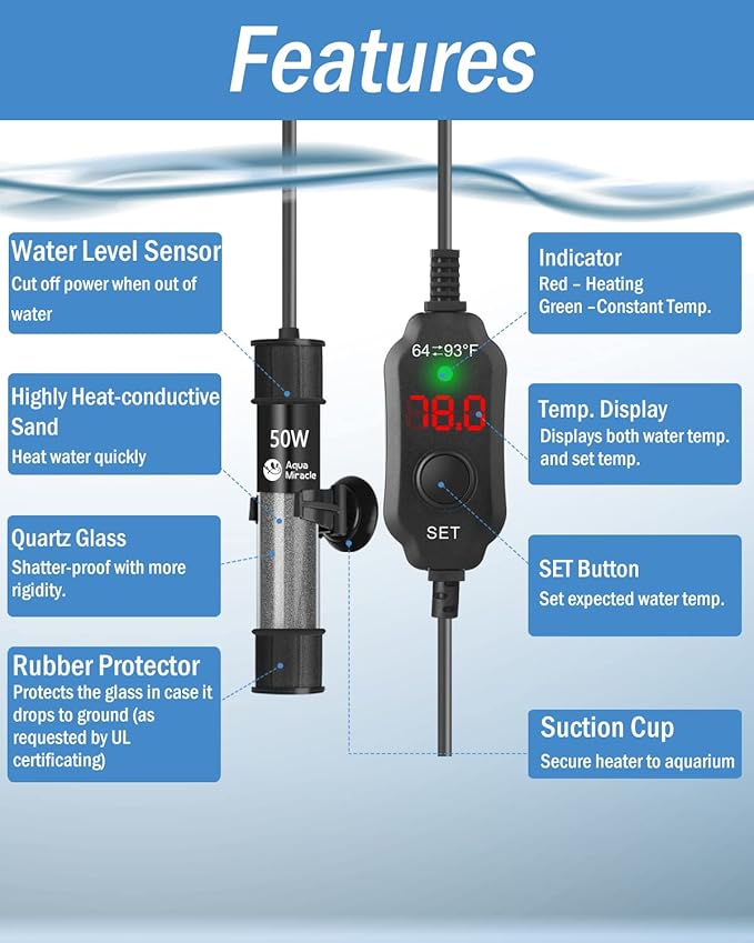AquaMiracle Adjustable 50W Aquarium Heater Submersible Fish Tank Heater Super Short Aquarium Heater with LED Digital Display Thermostat, for Tanks 5-10 Gallons