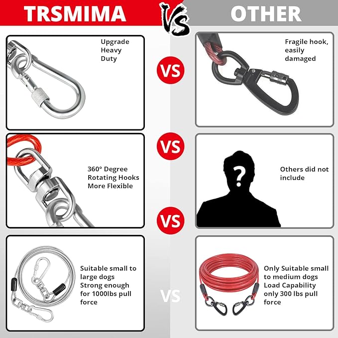 - 🐶High Tensile Strength:jenico dog wire leash cable is a heavy duty dog chain, made of 5mm high-strength galvanized steel wire rope with PVC coating,which are professionally tested for tensile and quality, it can withstand up to 85KN of tensile force.providing superior strength and durability against breakage!Good corrosion resistance, will be reliable to use.