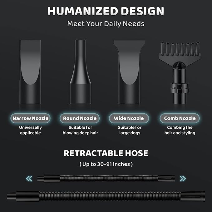 - Multifunctional Use: This pet blow dryer is equipped with 4 different nozzles to meet different drying needs for different pets. For your various needs, the pet hair dryer can also be used to dry your car, floors, furniture, etc.
