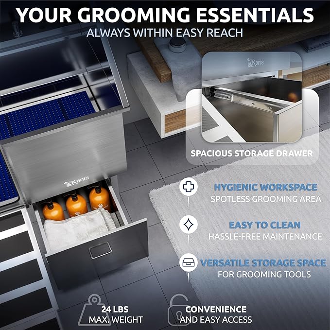 • SPACIOUS STORAGE & HYGIENIC SETUP: The sliding drawer holding up to 24 lbs, provides generous space for grooming tools and accessories. Keep essentials within reach while maintaining a clean pet wash station with hassle-free upkeep