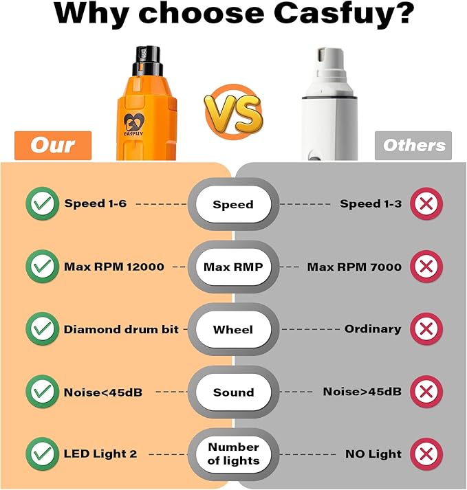 - Say goodbye to over-clip: Over-clipping is the worst during nail trimming. Dual LED lights on Casfuy electric dog nail trimmer will help you prevent it. The lights let you see the nail quick easier, making the grinding safer and more precise. The advanced diamond drum bit grinder will deliver the most comfortable pet claw grinding.