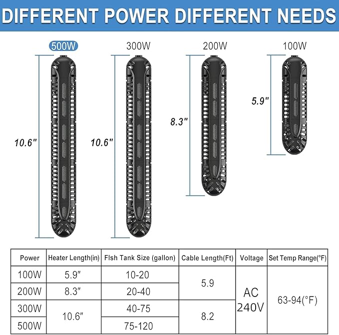 - 【Aquarium Heater 100W】-- The 100W aquarium heater produces stable power with quick heat up. It's length is 5.9'', voltage 110-120V, power cord is 5.9ft (cable cord length: 4.6 feet, power cord length: 1.3 feet) . Aquarium heater for 10 to 20 gallons, ideal uses for the marine saltwater and freshwater, fish tanks, turtle tanks, betta tanks, small ponds, and so much more.
