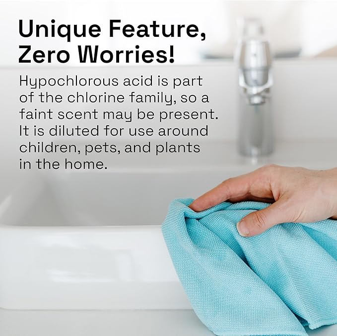 - Unique Feature: Hypochlorous acid is a part of the chlorine family, so there may be a faint scent. The hypochlorous acid is diluted for use around the home with children, pets, and plants