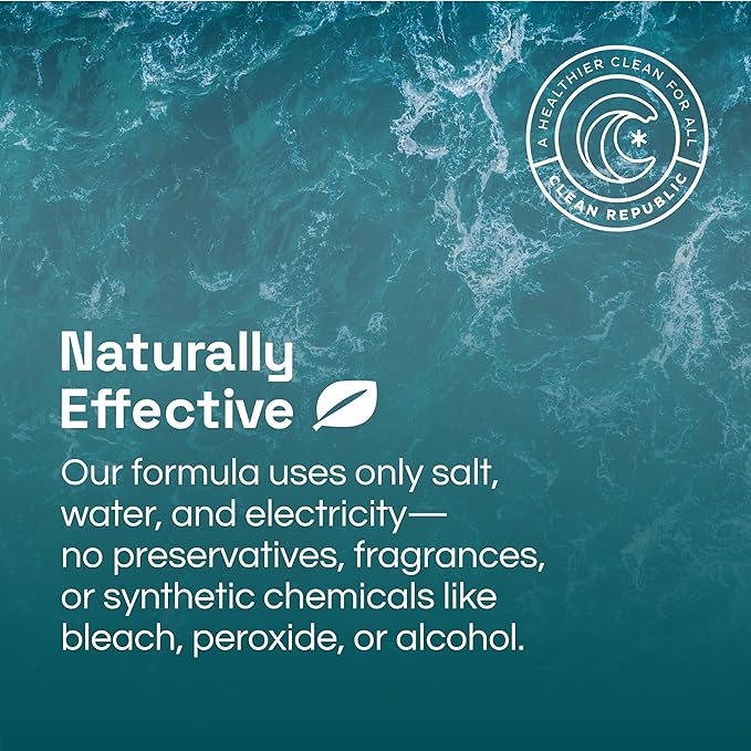 - Pure and Simple: Our natural formula is made with just salt, water, and electricity, with no preservatives, fragrances, or synthetic chemicals like bleach, peroxide, or alcohol. It is non-corrosive, eliminates odors, and freshens the air