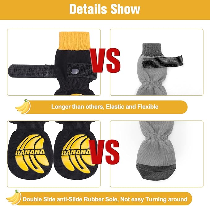 - 🍌Non-Skid: For hardwood floor, if your baby has problems who was splaying and keeps slipping on your wooden floors with back legs, we suggest you would buy these the soles which have anti-slip adhesive, which can provide extra traction. Besides, wearing a non skid sock prevents dogs from licking and irritating the wound further aid in healing foot wounds.⚠️Please note we have design patent to protective this exclusive design !