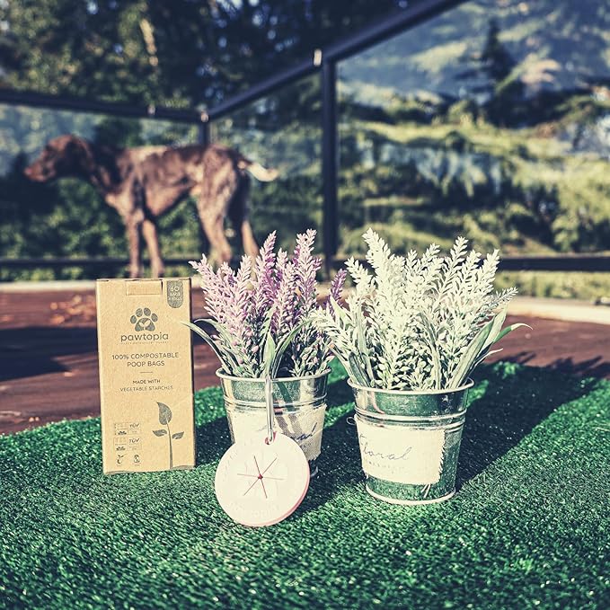 - Purely compostable dog poop bag (60 bags, pink bag carrier): Pawtopia supports sustainable living and does not harm the environment (unlike plastic bags). Our biodegradable dog poop bags, made with vegetable starches (corn starch), are 100% home compostable and break down into natural substances such as water, Co2, and biomass. Our biodegradable poop bags are certified with OK Compost Industrial under EN 13432 (equivalent to ASTM6400), and OK Compost Home by Tรผv Austria under AS5810/ NF T51800.
