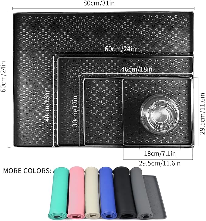 - [Quantity & Size] Contain 1 black silicone pet food mat - 11.8" x 11.8" diameter. Available in 6 colors. The foldable square shape and size won't take up too much space. Suitable for small and medium cat dogs.