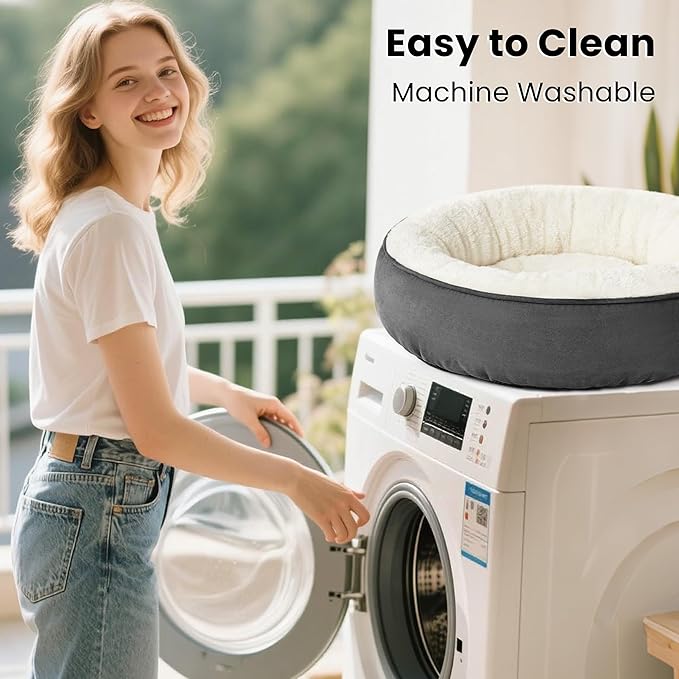- Donut Cuddler Shape: The round dog bed allows pets to curl up while the raised rim creates a sense of security and provides head and neck support. Premium ultra-soft filling offers joint and muscle pain relief, is a great choice for elderly or sick dog pets. The 25 inch round pet bed is perfect for cat or puppy and other pets up to 30 lbs.