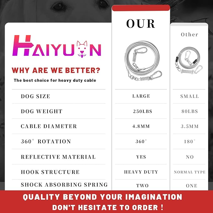 - STURDY DOG TIE OUT CABLE:The HaiYUAN multi-functional, multi-size, ultra-tensile pull cable provides greater range of motion for dogs. Designed for large, medium and small dogs up to 165 lbs.