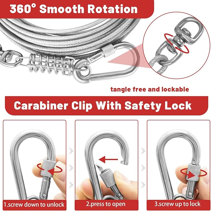 - THE NEWTEST CLIP: The rotating clip can rotate 360 °, and the clip is fixed with a ring at the bottom,so that the dog leash will not fall off the hook easily. Provide more space for dogs to move without entanglement. The screw on the swivel hook can lock it to prevent your pet from escaping from the cable and running to dangerous places. pet from breaking free of the cable and running into harm's way.
